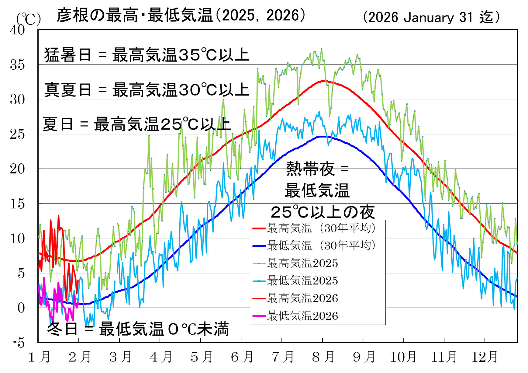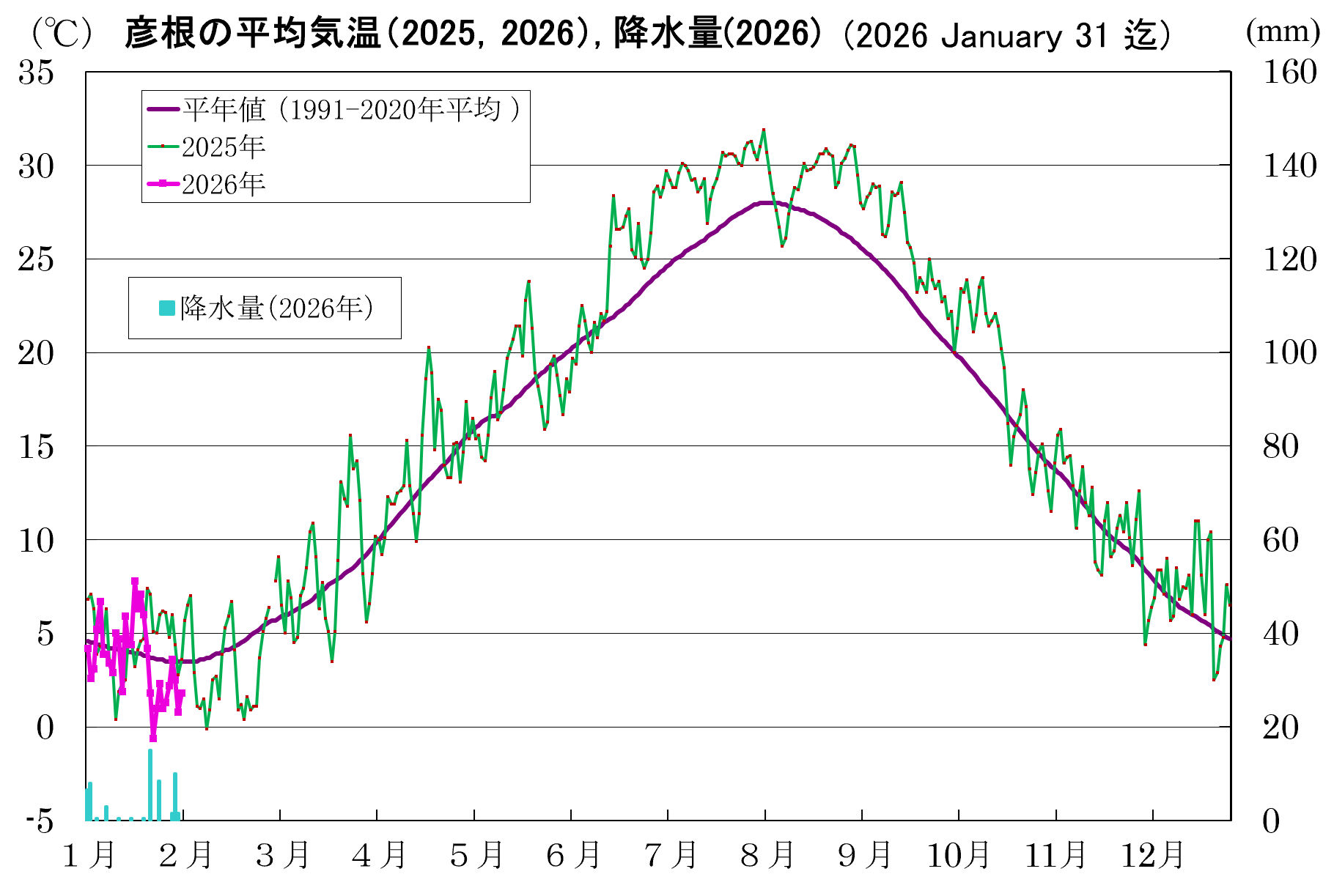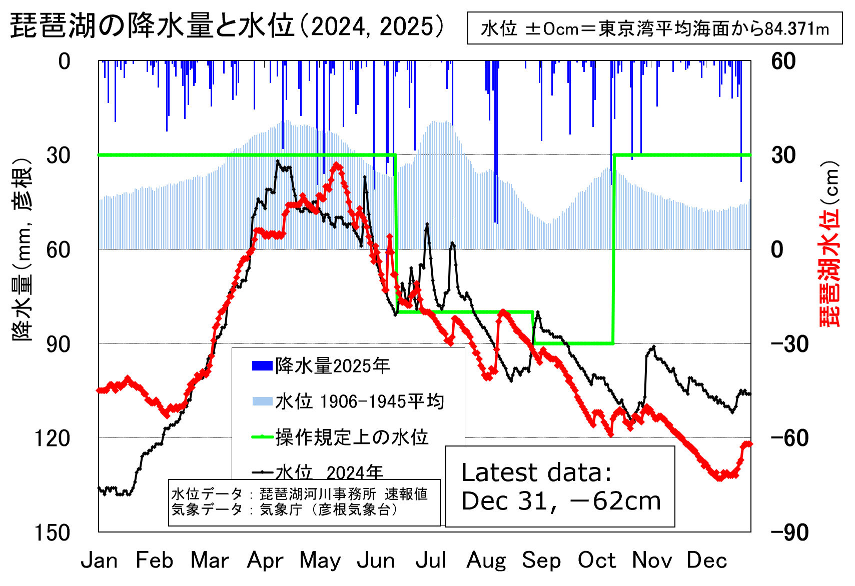 2026年2月1日 | 謹賀新年。琵琶湖の水位,彦根の気温(2026年分)を更新。下記【データベース・資料集】参照。日本海側では積雪がどんどん増えているのに,太平洋側では降雨が記録的に少なく,京都市や神戸市など12府県庁所在地では1月の総降水量「0ミリ」が記録されている。琵琶湖は湖北での降雪のおかげで水位を保っているようだ。